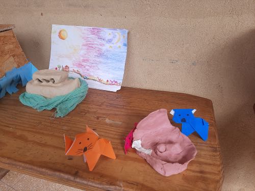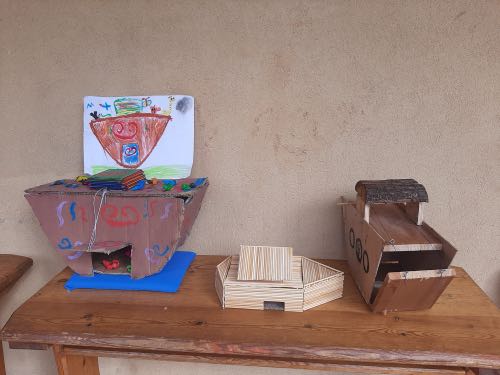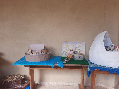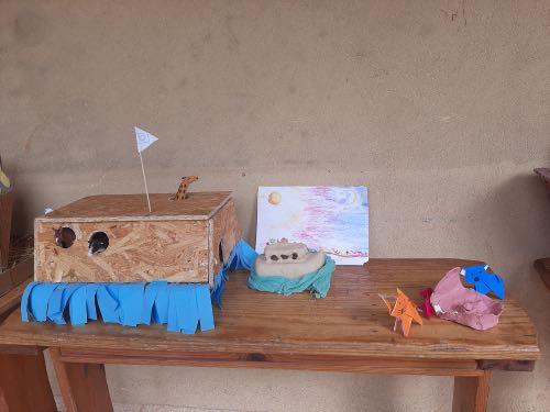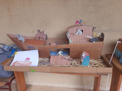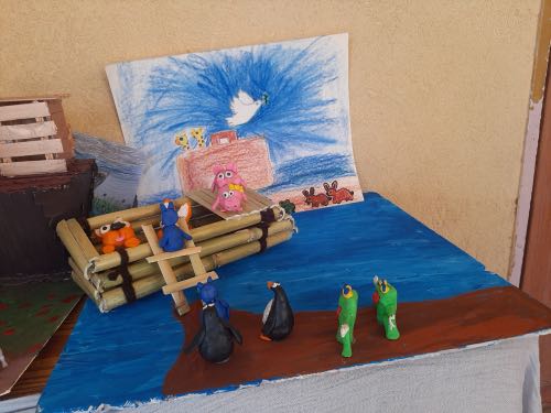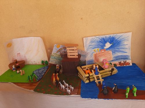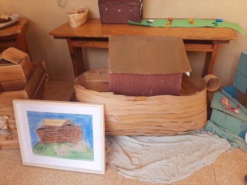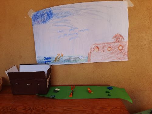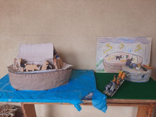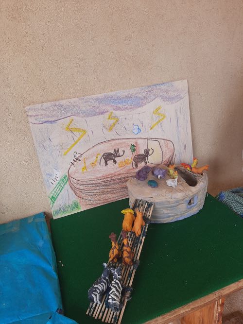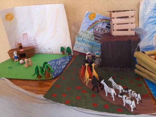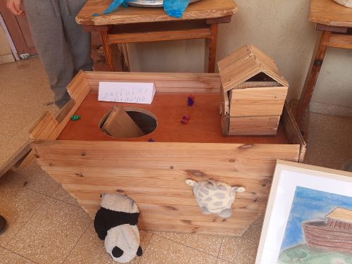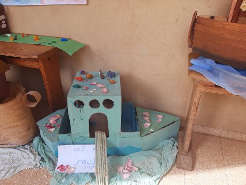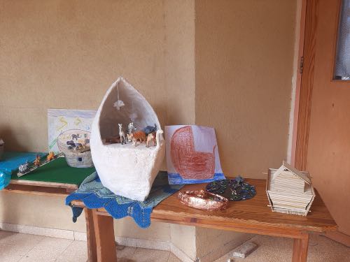 לאחר מכן הגיעה תקופת תורה בה למדנו על תיבת נח. במהלך הסגר כל ילד הכין בביתו תיבת נח מכל מני חומרים: חימר, עץ, בוץ, גבס״.