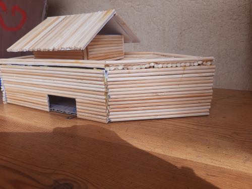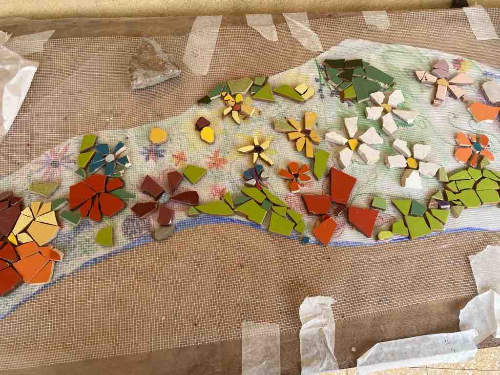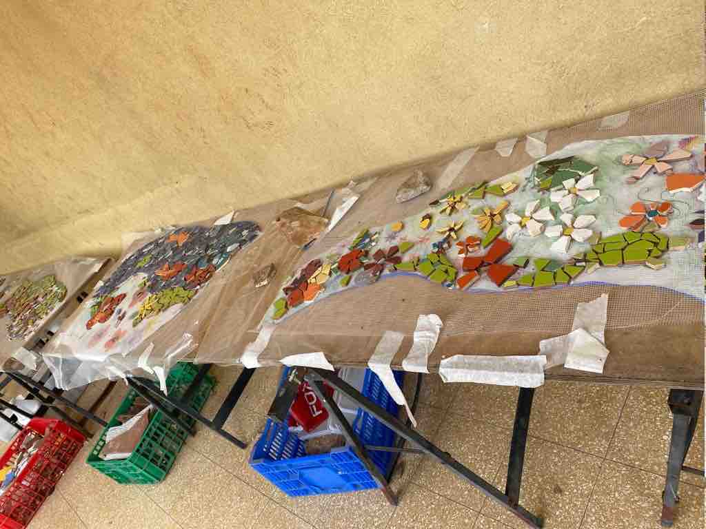 מחוץ לכיתה עומדים שולחנות עם שלבים ראשוניים של עבודת פסיפס שהכיתה החלה להכין לקראת תקופת הבנייה שתתקיים אחרי חופשת הפסח. הכיתה צפויה לבנות ערוץ מרוצף פסיפס לנחל הזורם במתחם בית הספר, ומעליו לבנות גשר מעץ.